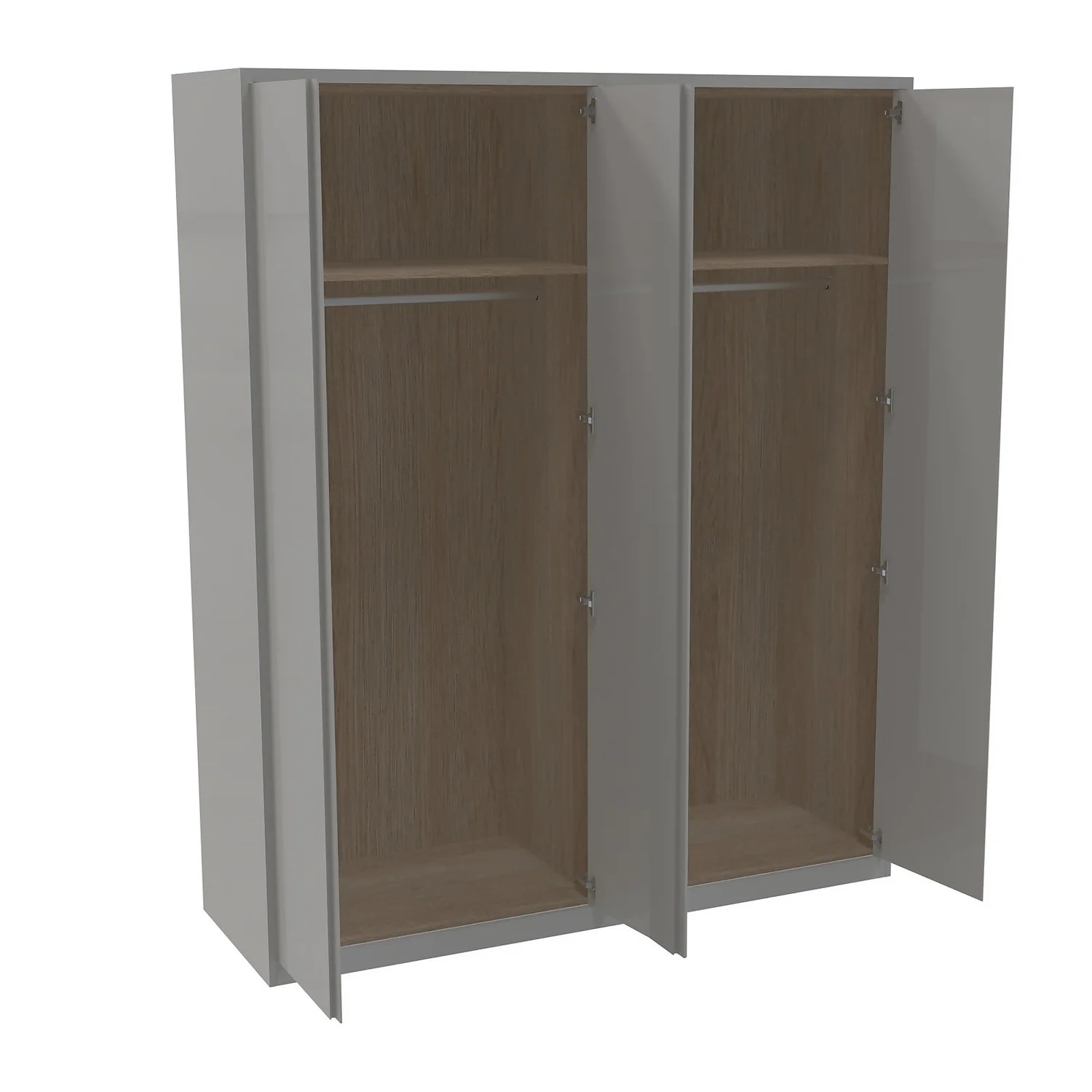This four door wardrobe (2 x double units) features an oak effect internal carcass and includes end panels, plinth and matching cornice all in a finish to match the beautiful luxe gloss grey handleless doors. The wardrobe features premium soft close clip-on Blum hinges, two shelves and two hanging rails. You can customise your wardrobe with our additional internal storage options (available separately) including internal drawers, shelves, dividing shelves and extra hanging rails.