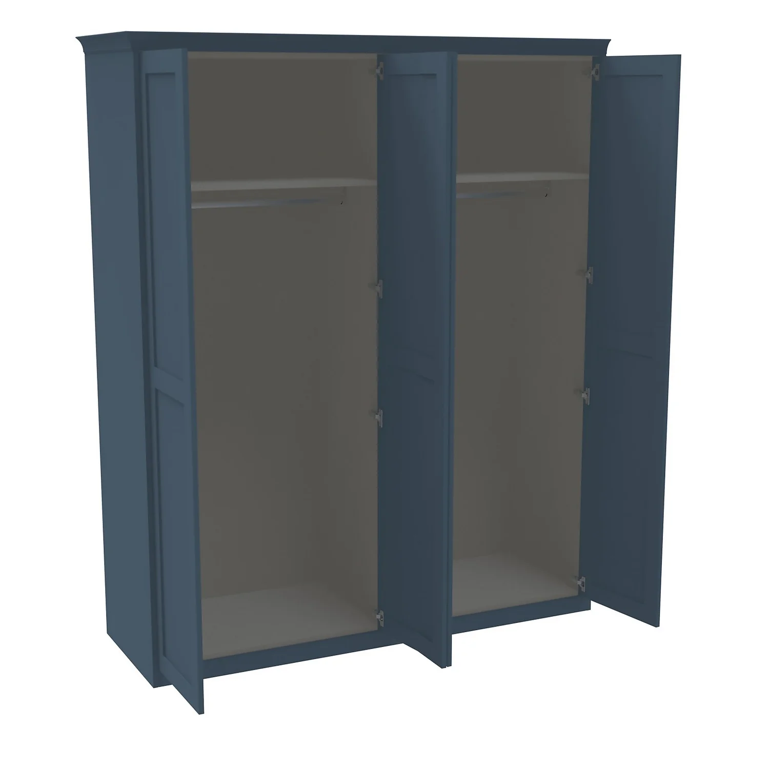 - A fitted look is achieved by using clad on panels, plinth and cornice which are all included with this wardrobe. All the elements that clad the internal grey carcass (clad on panels, plinth and cornice) are a perfect match to the matt navy blue shaker door