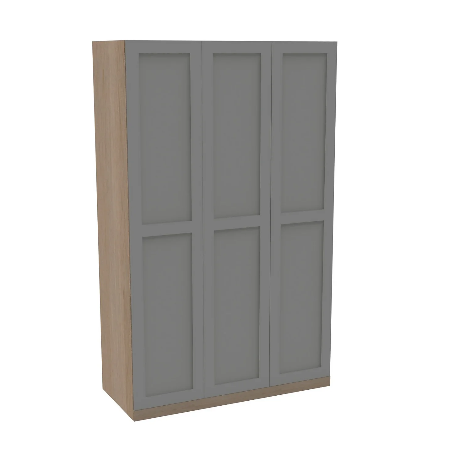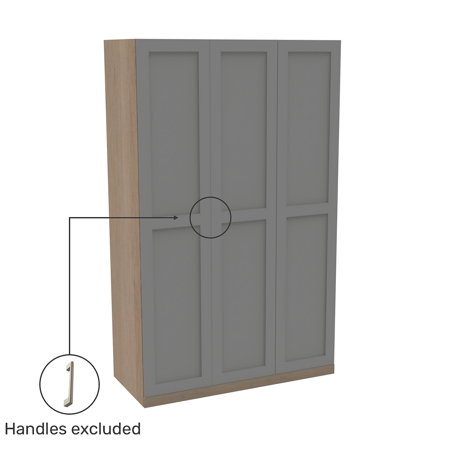 The House Beautiful range is exclusive to Homebase and offers a selection of different finishes and storage configurations to suit your needs. With a range of carcass colours and contrasting door designs, you can select the look to fit your bedroom aesthetic. This triple wardrobe (one double and one single) features an oak effect carcass and beautiful shaker doors finished in a luxurious matt grey. The wardrobe features premium soft close clip-on Blum hinges, two shelves and two hanging rails. You can customise your wardrobe with our additional internal storage options (available separately) including internal drawers, shelves, dividing shelves and extra hanging rails. Choose your handles from our range of both traditional and modern to suit your desired look.