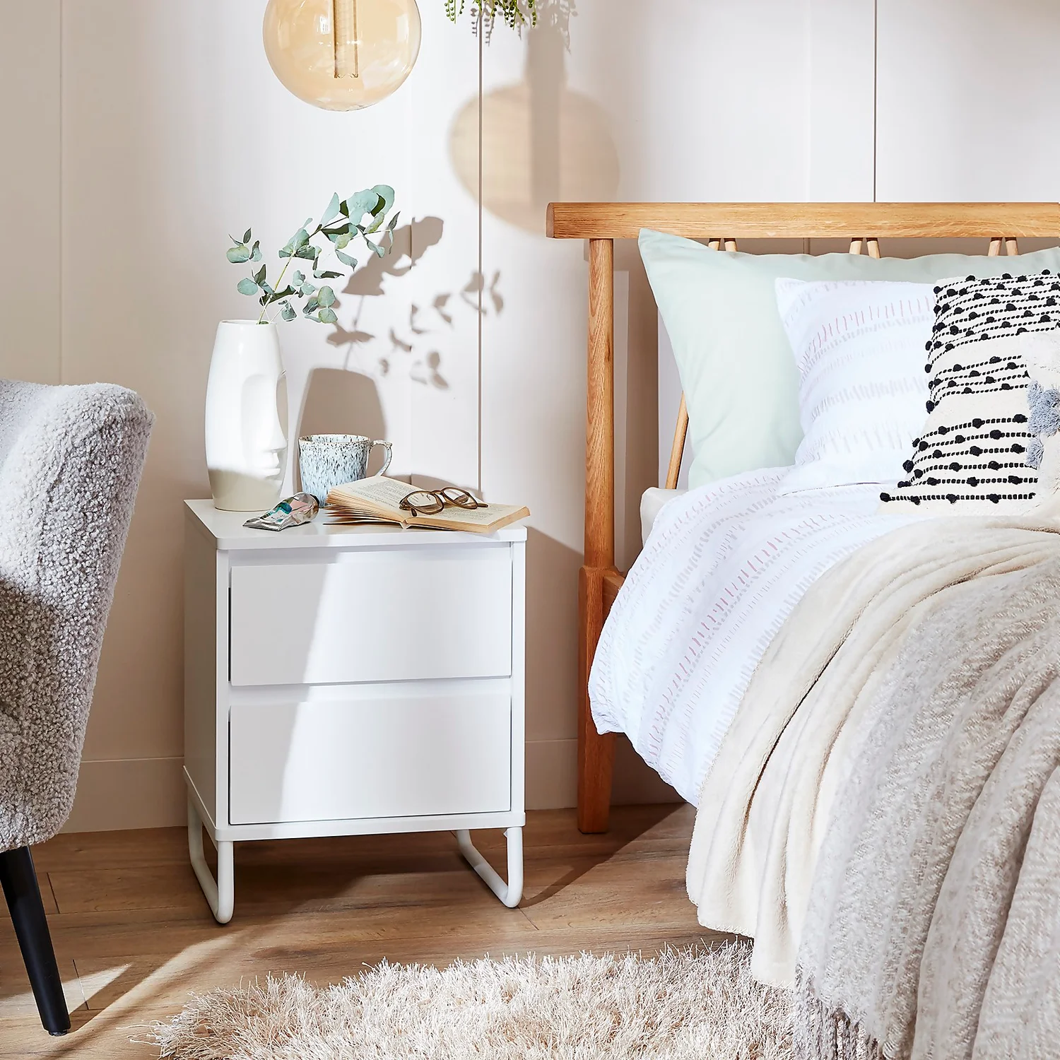 Hello Milo. Perfect for busy, everyday life in your home, the Milo bedside table has an easy modern vibe. Two handleless drawers give this piece smooth lines while the white lacquer finish keep Milo looking clean and fresh. It’s raised on sturdy, metal ski legs to give a sleek finish.